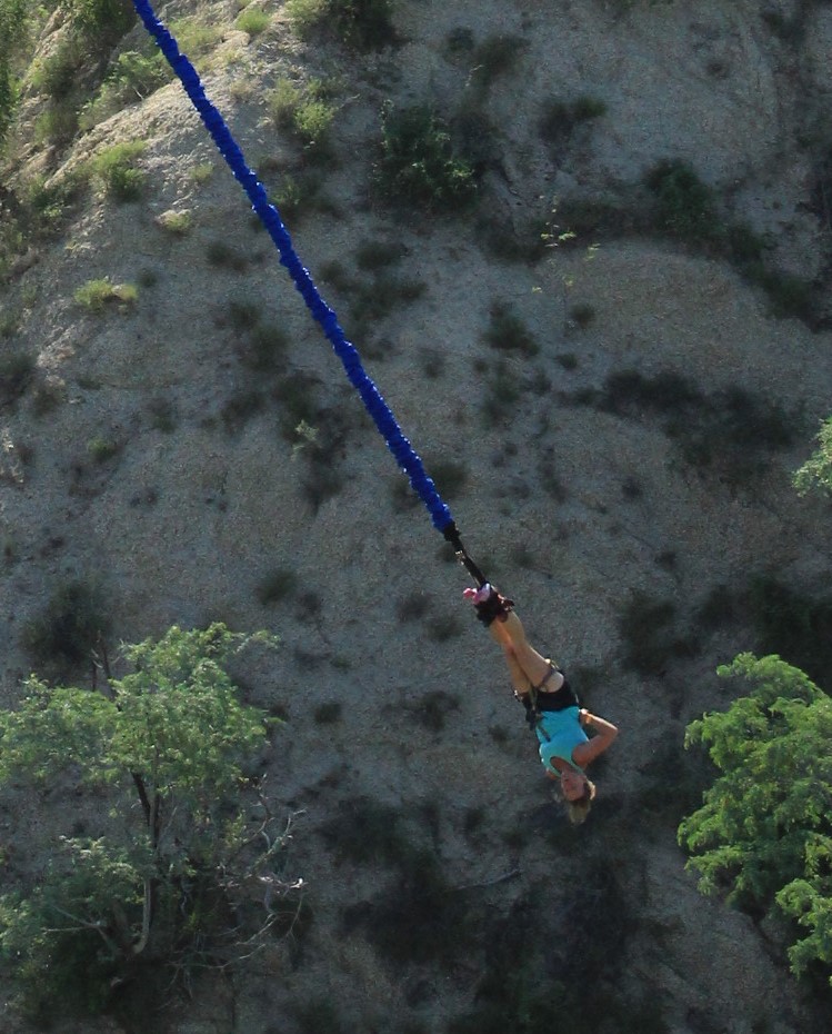 I put my toes slightly over the edge. My stomach hurt, my bowels were gurgling, head pounding, heart racing, and knees literally knocking together. I had never physically felt fear. I felt it now. Like, I really felt it. This is where I needed the crazy in mymind to calm, but oh no, the crazy went into overdrive. My thoughts were racing. I wasn’t worried about dying anymore. I mean my kids had survived. All I could focus on was this whole shit myself issue. I mean if it did happen I couldn’t hide it. I would be hanging upside down for several minutes after the jump which would allow it to run down my back and onto my head. I could very likely have shit in my eyes when I was pulled back to the gondola. Really…this was what I was going to focus on, but I couldn’t stop thinking about it. I don’t know. Maybe it was a survival thing and my brain was trying to distract me. It worked. The next thing I knew the guide counted down “3…2…1…Bungee”. I jumped. I remember thinking “Holy Crap I think I did it.” I clenched EVERY SINGLE MUSCLE on the way down and was stiff as a board when the bungee caught at the bottom. My back was torqued, my ankles were hurting, my stomach had dropped into the nether regions of my body, but I had kept all bodily functions tucked safely inside where they belong. Breathing slowly started to return to my body.